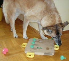 Spiele, die auf problemlösungsorientiertes Verhalten abzielen, das Erlernen von Tricks und kleinen Kunststücken fordert und fördert unsere Hunde, lässt sie Selbstwirksamkeit erleben und darüber Selbstvertrauen aufbauen.